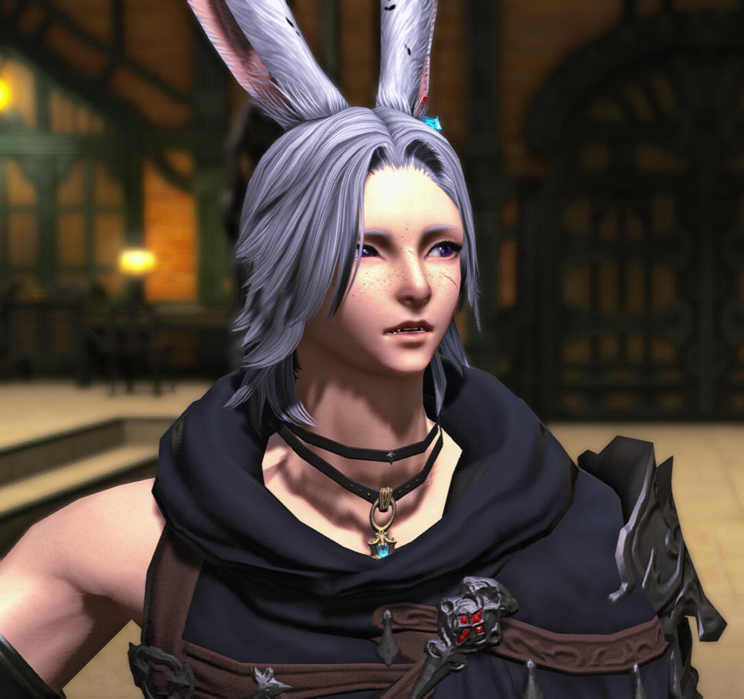 Mousey was born in a small village located in a Auspice's domain in the Skatay Range. Shortly after their birth he was claimed to be a monster reborn. Their right ear was branded with the monster's still burning bones, leaving a burn that will never heal, and a part of its lingering rage. The village was forbidden from killing or abandoning the branded kit, so instead they were ostracized. They were punished for every little slight, and forbidden from interacting with the other kits.Due to the minimal contact with others and being forced to stay quiet, Mousey never learned how to talk, or language overall. Their Echo awakened early, letting them make sense of the sounds said to them.On their 9th spring, they were pulled aside by one of the older viera and taught basic survival skills, alongside how to use a bow. This training lasted a year, the following spring they were thrown out of the village with only the tools they had on hand.Cast out from safety the Auspice made itself known. The huge beast was similar to a coreul, and had glaring green eyes that shimmered in the dark woods. It hunted the kit as they struggled to survive in its domain, keeping the viera from staying in one place for long.Mousey is unsure how many years he spent lost in the lightless woods the beast called home, but one day they heard a voice calling for them from a distance. The voice and language was unfamiliar, but they decided to take the risk and follow it.